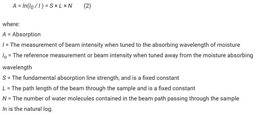 The Beer-Lambert principle states that when light energy at certain wavelengths travels through gas, a certain amount of energy is absorbed by the water within the path. The amount of light energy lost is related to the concentration of water.