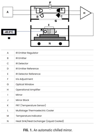 The cooling module consists of a multi-stage stack of arrays of P-N junctions arranged in a back-to-back orientation. When direct current is applied to the P/N junctions, electrons flow from the P junctions’ leaving holes. The energy holes are filled with heat energy that flows from the mirror. The P-N junctions are additionally thermally coupled to a metal heat sink. If the polarity of the current is reversed, the mirror is heated. Visible or infrared light is emitted and aligned to reflect off the mirror. The reflected light is received by a photodetector. When the mirror is cooled sufficiently, water vapor condenses on the mirror and the light received by the photodetector decreases due to both absorption and scattering of the light. The signal from the photodector is then utilized in a feedback control loop to maintain a constant mass. A precision platinum resistance temperature detector (PRTD) measures the temperature of the mirror. The heat pump can also be augmented by refrigeration (evaporator core) or a liquid coolant block.