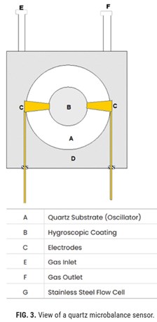 Quartz microbalance hygrometers. Quartz microbalance hygrometers (FIG. 3) consist of a quartz substrate that is coated with a hygroscopic polymer film. When a voltage is applied, the quartz oscillates at a resonant frequency. When the sensor is exposed to gas with water vapor, water is adsorbed by the hygroscopic coating, and the resonant frequency changes in accordance with the increased mass of the sensor. The adsorption of water into the sensor’s substrate is proportional to the partial pressure of the surrounding water vapor.