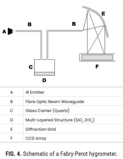 Fabry-Perot hygrometers. The sensor head in Fabry-Perot-type hygrometers consists of a multi-layered structure comprising materials with high and low refractive indices (FIG. 4).