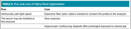 The sensor is mounted on the end of a stainless-steel probe and connected via a fiber optic cable to the control unit. The unit requires temperature compensation and pressure compensation if a ppmv readout is required. The pros and cons of Fabry-Perot hygrometers are detailed in TABLE 4.
