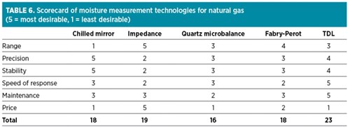Contact-based sensors may be partially contaminated and continue reading, although experienced users may be able to determine contamination has taken place by observing sensor behavior in terms of response to step changes in moisture or an actual step change in process readings after the contamination event. In most cases, if sensors become contaminated, they can be cleaned, purged with a dry gas and returned to service. A scorecard of moisture measurement technologies for natural gas are detailed in TABLE 6.