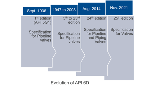 Brief history of the API 6D standard. The API 6D standard originated in 1936 and was titled “API 5G1: Specification for pipeline valves.” It sought to codify and standardize the minimum requirements for wedge gate, plug and swing check valves used in pipeline service. In 1947, the 5th edition was released, with the standard’s code changed to API 6D, which has remained the same (FIG. 1).