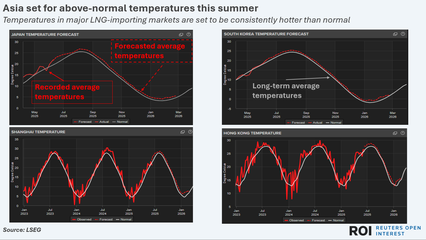 Average temperatures in Japan - the second largest LNG importer after China in 2024 - are expected to register around 6% above the long-term average from now through the end of August, data from LSEG shows.