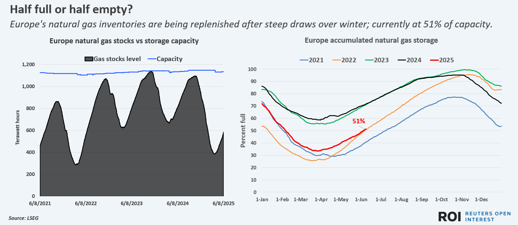 Currently, Europe's gas stockpiles are around half full, which compares to around 70% full at this time of year in 2023 and 2024, according to LSEG.