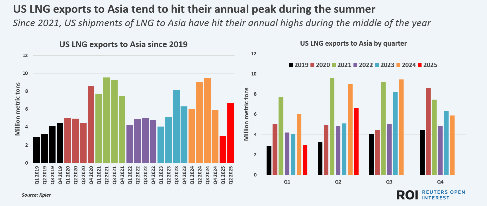 Between 2021 and 2024, U.S. LNG exports to Asia during May, June and July averaged around 7.8 MM tonnes (t) a month, according to data from commodity intelligence firm Kpler.