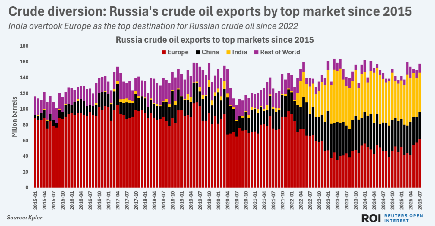 Indeed, between 2022 and 2024 India's imports of Russian crude oil more than doubled, from 321 MMbbl in 2022 to 651 MMbbl in 2024, data from commodities intelligence firm Kpler shows.