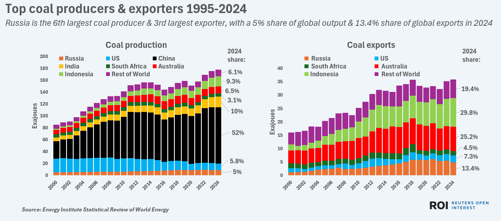Because of a large domestic coal-fired power plant fleet, Russian coal mine production has been able to remain largely steady since 2022 as local power firms consumed additional supplies that had previously been sent for export. In 2024, Russia's coal production was around 2.3% down from 2022's total, while exports were down nearly 10%.