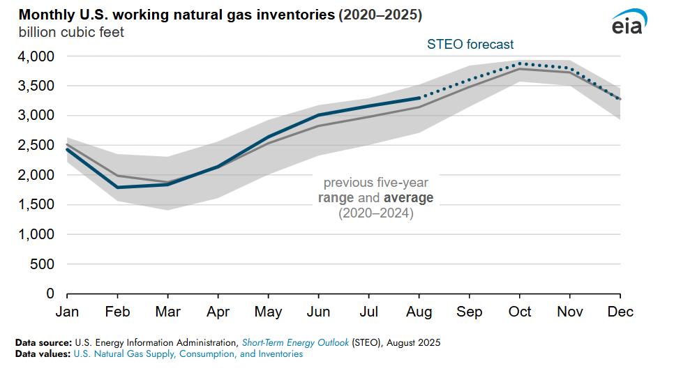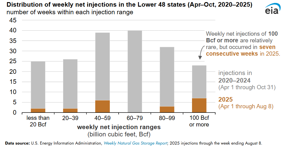 Weekly net injections exceeding 100 Bft3 in the Lower 48 states generally occur in about three weeks per year, based on data for the previous five years (2020–2024). In 2025, weekly net injections exceeded 100 Bft3 in seven consecutive weeks, based on data through August 8. However, the EIA expects smaller weekly injections through October as more natural gas is consumed for power generation and exported as liquefied natural gas (LNG).
