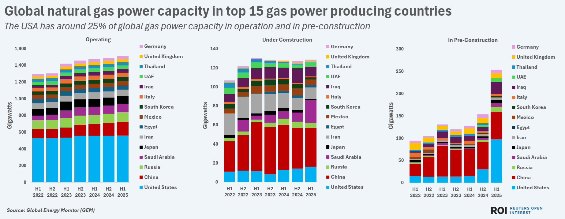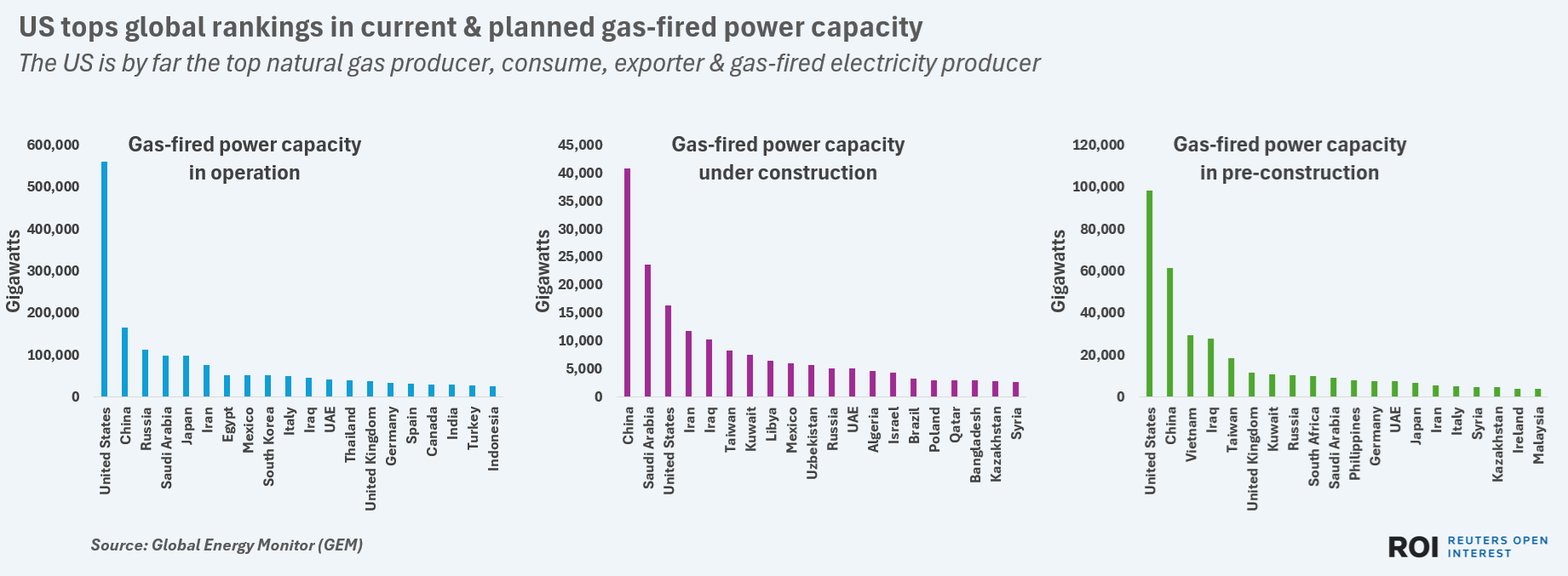 The U.S. ranks third in terms of gas capacity currently under construction, as China is building out roughly 41,000 MW of new capacity compared to 24,000 MW by Saudi Arabia and 16,300 MW being constructed in the U.S., GEM data shows.