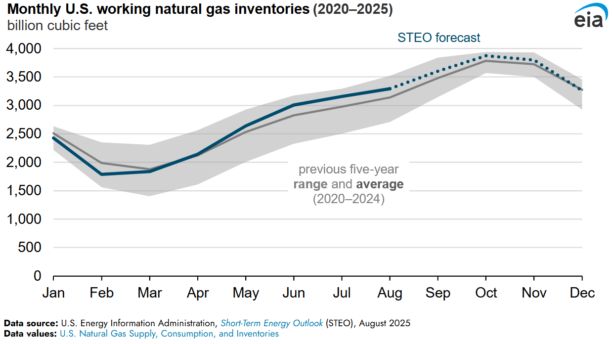 The EIA noted that U.S. natural gas production outpaced consumption at the start of the 2025 injection season, which runs from April through October. Inventories were 7% above the 5-yr (2020–2024) average as of Aug. 8, compared with 4% below average at the end of March.