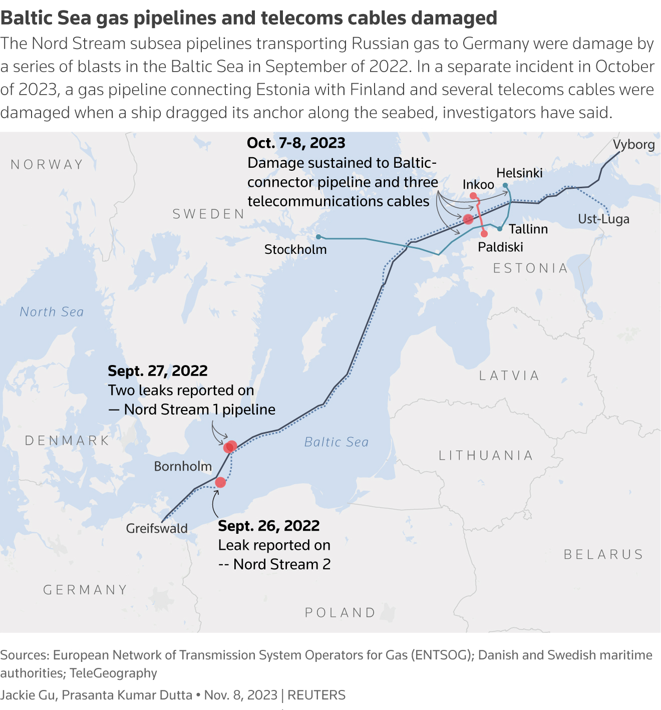 How were the pipelines damaged? On Sept. 26, 2022, Swedish seismologists registered several blasts, some 17 hours apart, off the Danish island of Bornholm that ruptured three of the four NS pipelines, sending plumes of methane into the atmosphere.