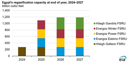 This year, Egypt is seeking to address any shortfall in natural gas supply by ramping up import purchases of liquefied natural gas (LNG). It is also chartering three additional floating storage regasification units (FSRUs) that are scheduled to begin operations in Ain Sukhna on the Gulf of Suez and in Damietta on the Mediterranean Sea by the end of third-quarter 2025. A fourth FSRU, the Höegh Gandria, is scheduled to replace the Höegh Galleon, which has been operating at the Port of Sumed near Ain Sukhna, in fourth-quarter 2026.