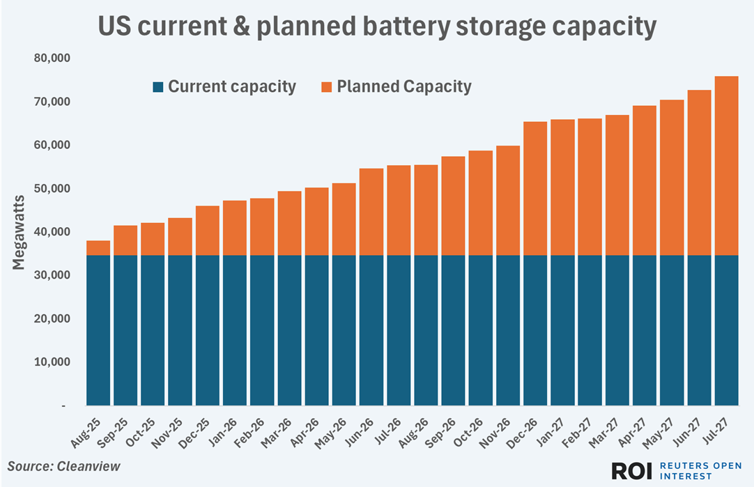 Around 8,000 MW of battery capacity is currently planned to be added to the U.S. utility network by the end of the year, according to data from energy data portal Cleanview.