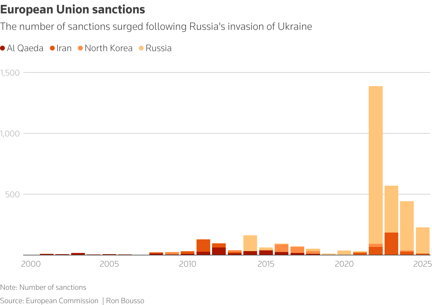 The major sanctions spike occurred after Moscow’s 2022 invasion of Ukraine. European Union sanctions on Russia rose from zero in 2013 to 2,534 in 2025. Washington put 3,135 new entities and individuals on its targeted list last year alone, 70% of them Russian, according to the Center for a New American Security.