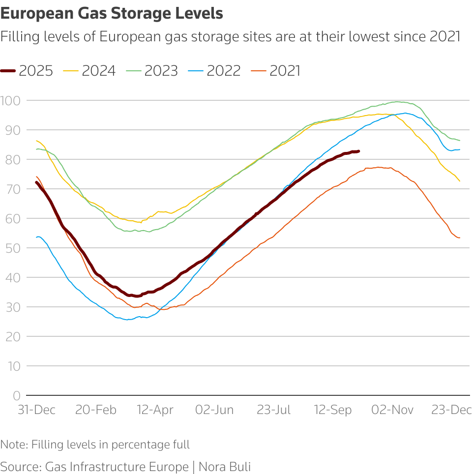 By the end of the current winter in March 2026, storage volumes could drop to a seven-year low of 29% of capacity, according to Kpler. That would add a significant risk premium to EU gas prices in 2026, Energy Aspects said.