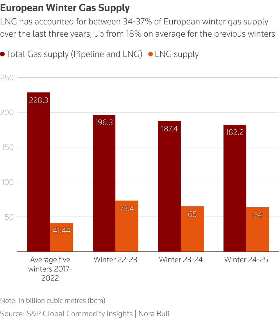 Europe will need to import up to 160 additional liquefied natural gas (LNG) cargoes this winter due to lower storage and a decline in pipeline flows from Russia and Algeria, according to analysts and data, deepening its dependency on U.S. gas.