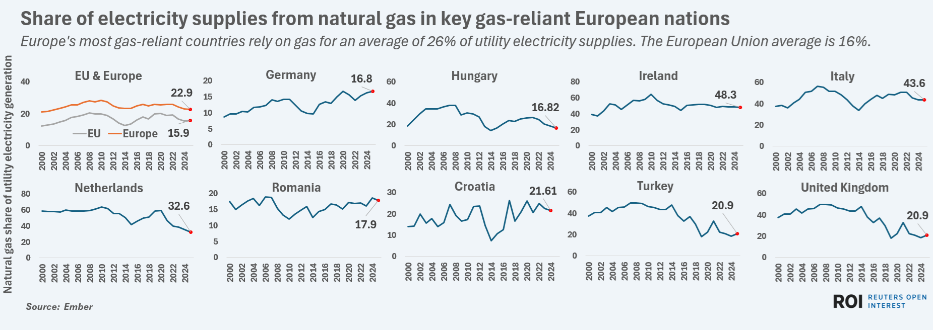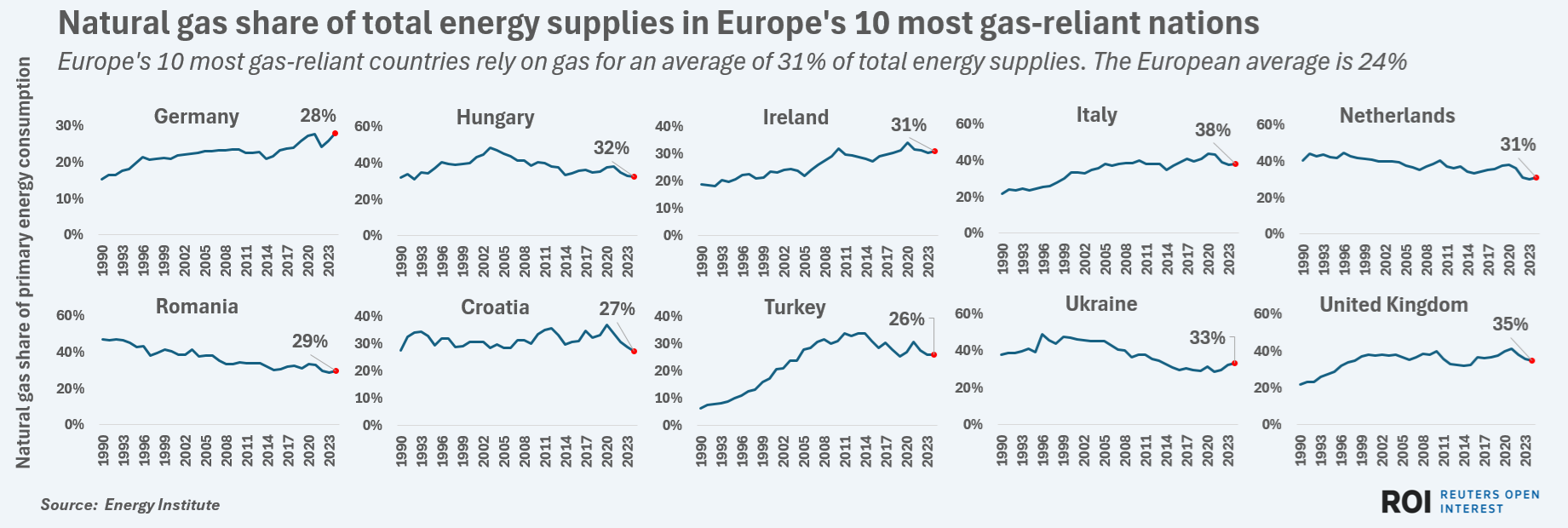 The United Kingdom, Ukraine, Hungary and the Netherlands round out the top five most gas-reliant nations in terms of gas's share of the total energy supply mix.