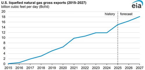 Ten years ago, on February 24, 2016, the first liquefied natural gas (LNG) cargo from the Sabine Pass Terminal was exported from the United States, marking the beginning of a new era in U.S. LNG exports. Today, the United States is the world’s largest LNG exporter, ahead of both Australia and Qatar. LNG exports surged from 0.5 billion cubic feet per day (Bcf/d) in 2016 to 15.0 Bcf/d in 2025, and in our February Short-Term Energy Outlook, the EIA forecast U.S. LNG exports to exceed 18.1 Bcf/d in 2027. LNG exports from the United States increased for several reasons, including abundant natural gas supply and reserves, flexible LNG export contracts, and relatively low feedgas costs. In addition, increasing international demand and a favorable investment climate have supported LNG infrastructure expansions in the United States.