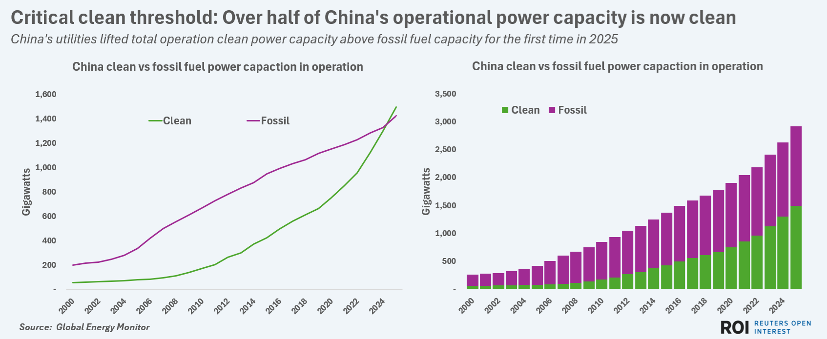 China had 1,494 gigawatts (GW) of clean power generation capacity in operation in 2025, compared to 1,420 GW of capacity fueled by coal, natural gas and other fossil fuels, data from Global Energy Monitor shows.