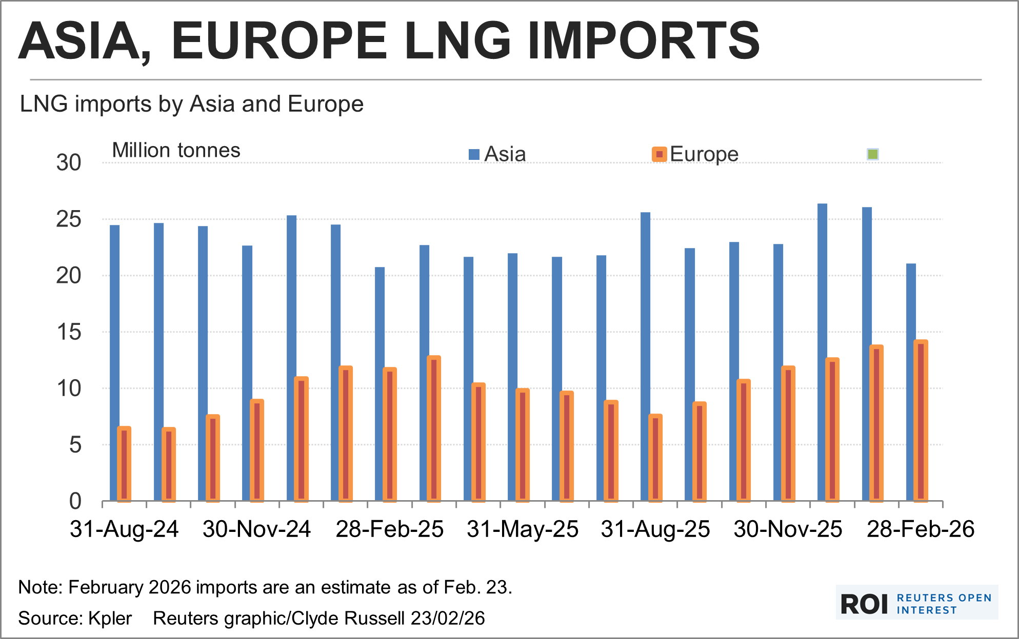 Asia's LNG imports have been largely steady, with commodity analysts Kpler tracking arrivals of 21.12 MM tonnes (t) in February, up marginally from the 20.75 MMt in February last year.