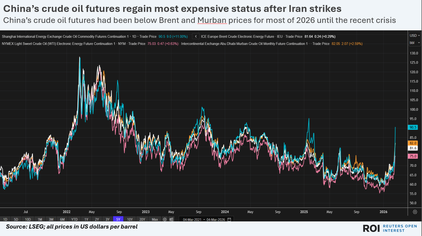 China is the world's largest oil importer and domestic crude oil futures prices have also surged this week, rising by 31% since last Friday compared to 12% increases in Brent and U.S. crude oil futures over the same period.