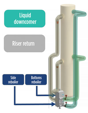 One application of a BAHX is for reboilers in natural gas processing and ethylene processing. A reboiler is a heat exchanger used to boil fluids from a distillation column and circulate the resulting vapor back to the column. A bottoms reboiler refers to a reboiler that processes the liquid from near the bottom of the column. A side reboiler processes the liquid from an intermediate point along the column. A simplified process flow diagram showing the possible locations of reboilers in a natural gas application is given in Fig. 2. In this case, it is a common practice to combine the bottoms and side into a single exchanger block. The piping highlighted in teal in Fig. 2 is the liquid downcomer piping, and the riser return piping is highlighted in grey.