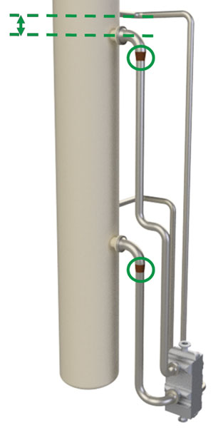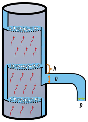 Flow from the riser return back into the column can disrupt the column hydraulics if the velocity is too high. It is good practice to include an expansion in the vertical riser just before the elbow to the column nozzle, as shown in Fig. 6. The elbow will disrupt the velocity profile to help prevent flow jetting into the column. Putting the expansion after the elbow could still lead to flow jetting into the column, and putting the expansion too far before the elbow could cause an undesirable flow regime in the vertical riser return piping.
