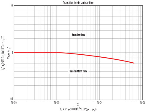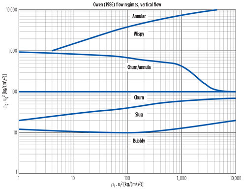 The piping should be sized to avoid undesirable two-phase flow regimes as much as possible, especially for the riser return piping. The chosen flow regime map should be applicable for the specified fluid composition, operating conditions and piping orientation.6 Several commonly used flow regime maps to choose from include those by Baker, Aziz, Hewitt and Roberts, Taitel and Dukler, Heat Transfer Research Inc., and Heat Transfer and Fluid Flow Service. The flow regime map for vertical flow by Owen7 is shown as an example in Fig. 7.