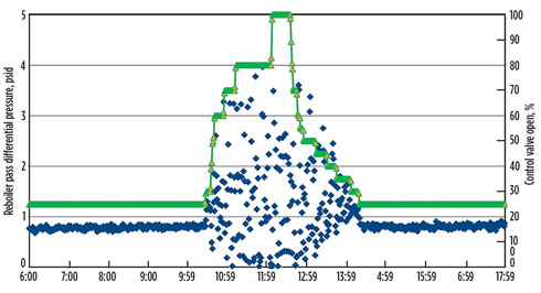 Measure and monitor pressure drop across the boiling pass inlet and outlet nozzle of the heat exchanger to assess flow stability. Fig. 8 shows an example of a problem with flow stability when the inlet valve was opened greater than 25%; when the valve was closed below 25%, the flow was again stable.