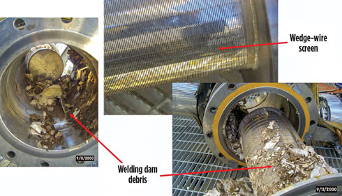 The small channel dimensions that make BAHXs perform so well thermally also make them prone to plugging if fluids are not clean. Strainers should be used to prevent debris from damaging or plugging BAHXs on all BAHX inlets. The recommended size is 177 micron. A strainer with some debris is shown in Fig. 11. A differential pressure gauge can be installed across the strainers to detect plugging. Clean the strainers periodically, especially after startup. Mercury guard beds are recommended for all natural gas streams, even if the inlet gas mercury concentration is below 0.1 μg/Nm3, since gas composition can change over time.2 The use of mercury-tolerant BAHX design features, including different header alloys and header guards, should be considered as additional protection in case of mercury breakthrough past the guard bed.