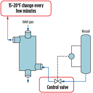 If a sudden loss of flow of inlet gas occurs, it is recommended to immediately stop the flow on all exchanger streams to maintain the temperature profile in the heat exchanger and minimize the risk of thermal shock. It may be useful to have a small control valve in parallel with the main control valve for better flow control at low flowrates or during startup. Control valves should be placed just before the exchanger inlet where the flow will be all liquid, and not in the riser return piping where the flow will be two-phase. Control valves must be properly sized to control the flow across the expected range of operating conditions.