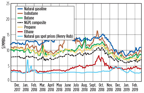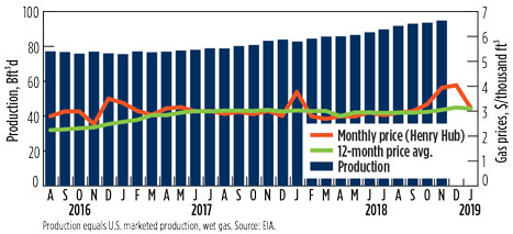 The Henry Hub natural gas spot price averaged $3.13/MMBtu in January 2019, down 91 cents/MMBtu from December 2018, as temperatures in most of the US remained milder than average despite a short cold snap. The US Energy Information Administration (EIA) expects strong growth in US natural gas production to put downward pressure on prices in 2019. The EIA expects Henry Hub natural gas spot prices to average $2.83/MMBtu in 2019, a decrease of 32 cents/MMBtu from the 2018 average. The EIA forecasts that US dry natural gas production will average 90.2 Bft3d in 2019, up 6.9 Bft3d from 2018. Production is anticipated to continue to rise in 2020 to an average of 92.1 Bft3d. GP