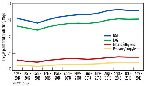 US natural gas plant field production of NGL, LPG, ethane/ethylene and propane/propylene, Mbpd |