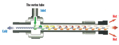In the self-heating vortex tube, the hot gas is used to warm the unit inlet nozzles (spot heating) prior to exiting the tube, thereby eliminating the likelihood of depressurizing gas freezing (self-heating provision). This provision makes the vortex tube technology unique among vortex devices.