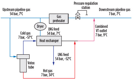 Single-stage LNG feed gas precooling. A hydrological process simulation of the proprietary vortex LNG feed precooling system at a city gate, utilizing the available gas pressure differential, is shown in Fig. 3.