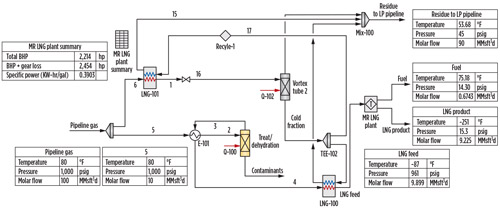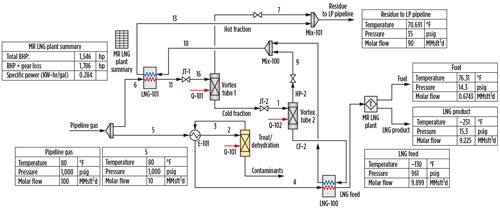 The net energy efficiency of two-stage vortex LNG feed precooling by reducing LNG feed temperature from 80°F to –130°F can be expressed as follows: –130°F – (–262°F) ÷ 80°F – (–262°F) = 0.38, or 62% energy savings. Note: At a PRS inlet gas temperature of less than the 80°F indicated in this model, the LNG feed gas temperature would be proportionally lower.