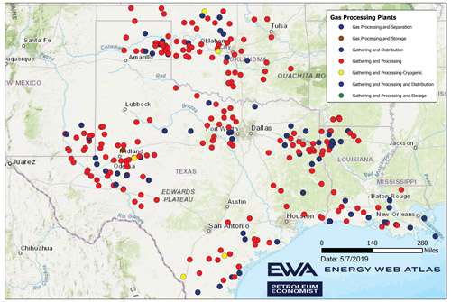 Energy Web Atlas is tracking more than 420 active gas processing and LNG projects around the world. Approximately 23% of active gas processing/LNG projects are in the US. This region has witnessed a significant increase in new gas processing and LNG capacity additions over the past several years. According to the US Energy Information Administration, the lower 48 states have a total gas processing capacity of more than 80 Bft3d. At approximately 32%, Texas has the largest market share of total US gas processing plants in the US. Oklahoma follows Texas with 16% market share for total number of gas processing plants. The figure below shows gas processing plants in Texas, Oklahoma and Louisiana. GP