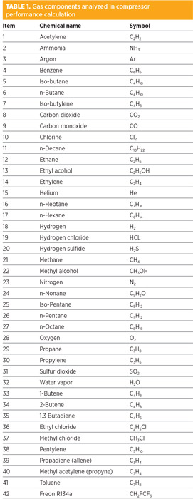 Data to be used as a starting point include the centrifugal compressor performance curve, the relevant gas mix composition and the thermodynamic conditions (pressure and temperature). After entering these data, the software calculates the expected compressor performance for inlet pressure, inlet temperature and gas mix composition for the design and reference scenarios. Calculation algorithms are able to predict both machine behavior and thermodynamic real gas properties in off-design conditions. Table 1 shows a typical list of gas components to be configured.