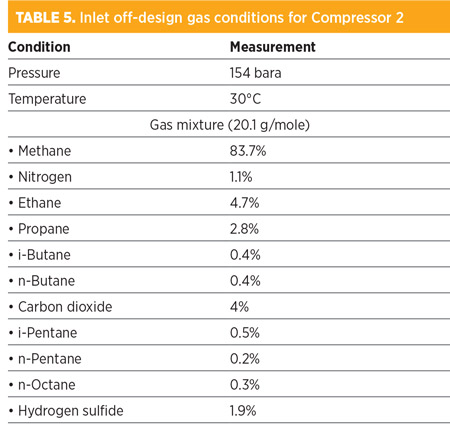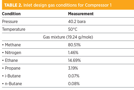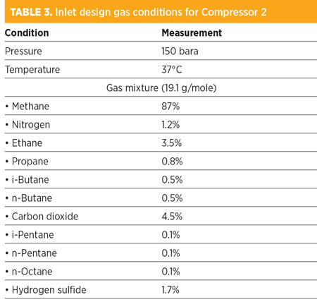 Fig. 2 and Fig. 3 show the design maps (discharge pressure vs. inlet flow) for Compressor 1 and Compressor 2. Table 2 shows the inlet design gas conditions for Compressor 1, and Table 3 shows the inlet design gas conditions for Compressor 2.