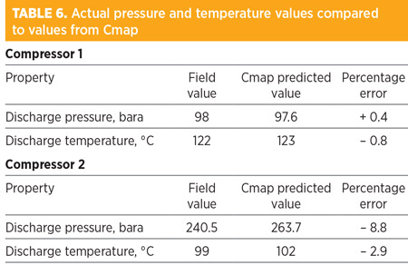 The Cmap software calculated, at the actual flow, the values of expected pressure, temperature, head and efficiency in the actual (off-design) conditions, and then compared these values to the measured ones. With reference to the field values, Table 6 compares the pressures and temperatures, as read from the transducers, to the values predicted by the Cmap software. The same comparison has been executed for head and polytropic efficiency. Note: In previous tables, the maximum error calculated for Compressor 1 is less than 1%, while the error calculated for Compressor 2 is approximately 9%.