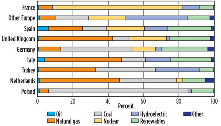 Some European nations are rich in hydrocarbon and renewable energy reserves, while others have few. At one end of the spectrum, France produces 90% of its electricity from renewable sources (including nuclear); at the other, Poland produces less than 15% from renewables. The Netherlands, home of the windmill, generates 40% of its power from gas but still relies heavily on coal.