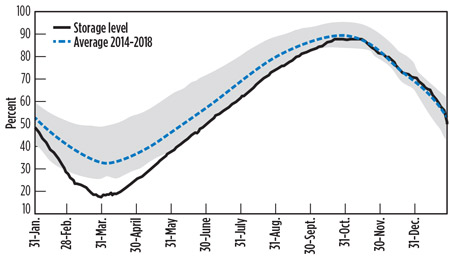 Fig. 5. At end-year 2018, European gas storage levels were near the 5-yr average, mainly due to sluggish demand at the start of the winter heating season. |