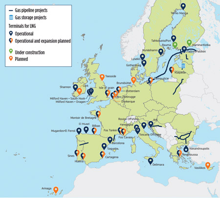 Europe is the local market for much of this LNG—particularly France, which has a 20% stake in Yamal. However, Novatek also has access to China and other Asian markets, for which Norway is competing in the LNG space. Europe has little choice but to increase LNG imports. A surge in new LNG import terminals, pipelines and storage capacity can be expected (Fig. 8), with many being FSRUs rather than onshore terminals.7