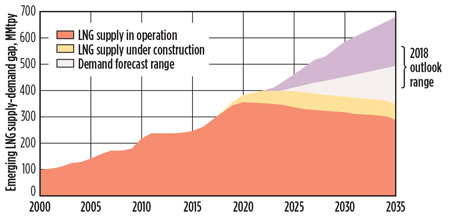 Although a temporary glut of LNG has emerged globally, pressuring down prices,10 this is expected to reverse around the middle of next decade as spare production capacity is limited by high CAPEX for new projects. Several frontrunners are scheduled to take FIDs this year. The LNG export industry must grow beyond that time, as evidenced by the forecast gap shown in Fig. 11. Note that this forecast supply-demand gap is dependent on global LNG consumption remaining steady or strengthening.