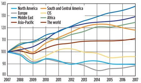 As Fig. 12 shows, globally, emissions are not remaining at 2015 levels; they are rising. Last year, carbon emissions from fossil fuels hit a record high worldwide of 37.1 metric Bt. Over the last 10 yr, only Europe and North America have reduced their CO2 emissions. North America has mitigated its emissions through shale gas production, which has, through commercial drive, displaced coal; Europe has done it through the heavy subsidy of wind and solar power, which have also displaced gas. Each will benefit the other. Low gas prices in North America will spur European LNG imports and give Europe an alternative to Russian gas imports. The springboard that the EU has given to renewable energy means that it can now look after itself.