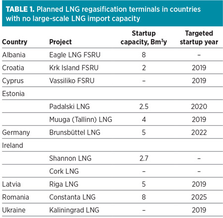 The region has 28 large-scale LNG import terminals (including four FSRUs) and eight small-scale LNG terminals in operation, with around 26% of total regasification capacity utilized. The EU is supporting 14 LNG infrastructure projects (including pipeline connections) that could collectively increase the bloc’s import capacity by 15 Bm3 of gas (529.65 Bsft3) by 2021, compared to Europe’s existing LNG import capacity of 210 Bm3 (7,415.1 Bsft3).8 Of note is that several terminals are planned for countries that do not already have a large-scale LNG terminal in place (Table 1).9
