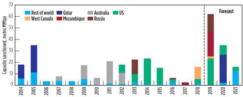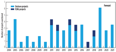 FIG. 7. Forecast for sanctioned capacity (both onshore and FLNG). This year is set to be the highest on record for project sanctions. |