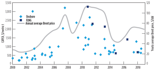 FIG. 2. CAPEX ($/metric t) of LNG facilities by FID date with yearly Brent oil price ($/bbl), in real 2018 prices. |