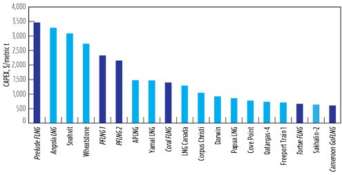 FIG. 3. CAPEX ($/metric t) of a selection of both onshore and FLNG vessels, in real 2018 prices. |